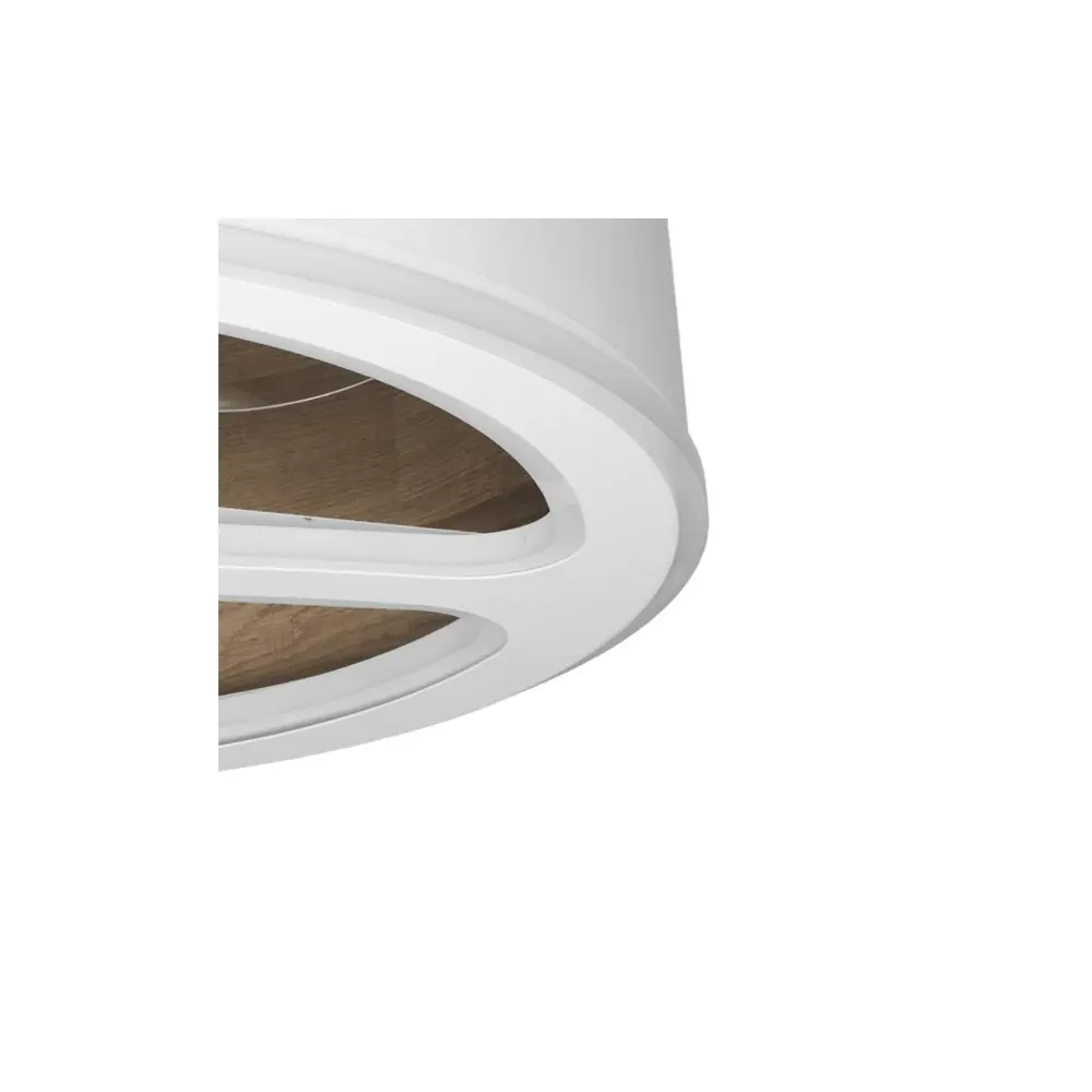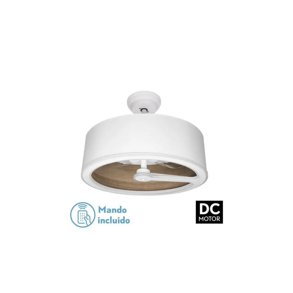 Ventilador DC serie TATIANA con pantalla BLANCA/MADERA OSCURA.Con ventilador de la serie CHOM.Realizado en metal, policarbonato y textil. De diseño exclusivo, moderno y muy decorativo, combinable con varios estilos de decoración, gracias a la variedad de colores madera del interior de sus pantallas.Con 3 aspas transparentes integradas en su estructura y 6 velocidades ajustables. Posee TECNOLOGÍA LED INTEGRADA con 110 watios de potencia, 9350 lúmenes y 3 temperaturas de luz, 3000-4000-6000k (cálida, natural y luz blanco frío). Sus dimensiones son de 46/66x62x62 centímetros, con dos medidas de tija para instalar a distintas alturas.Incluye MANDO A DISTANCIA CON MEMORIA DE COLOR y TEMPORIZADOR 1/2/4 H. Esta serie tiene a juego una gran variedad de artículos para terminar en su decoración, como son los colgantes de 30,40 y 50 centímetros de diámetro, plafones, dos medidas de sobremesas, aplique, pie de salón y ventiladores, todos en blanco/madera negro, blanco/óxido, blanco/madera gris, bla