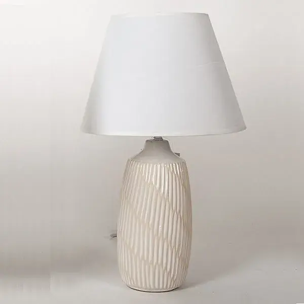 Bonita lámpara de sobremesa con acabados de cerámica y diseño lineal. En color crema, combinará a la perfección con cualquier tipo de mobiliario. Ideal para colocar en el salón, comedor o en la habitación sobre las mesitas de noche. Dada la calidez de sus materiales, aportará personalidad a tu estancia. Te iluminará y acompañará en tus momentos de lectura, bien de tu libro favorito o de la revista de la semana. De gran calidad, diseño y a un precio irresistible.