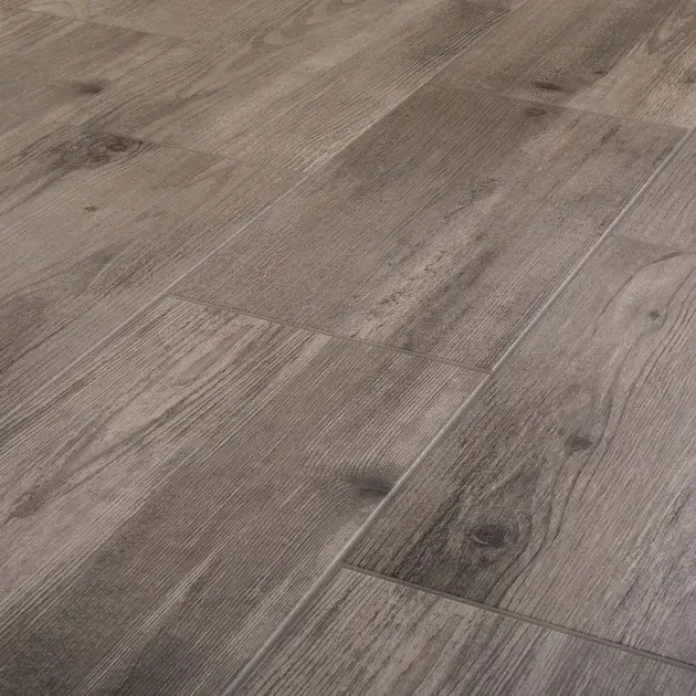 Baldosa para suelo en color roble gris y acabado mate, adecuada para interiores en cualquier estancia de la casa.