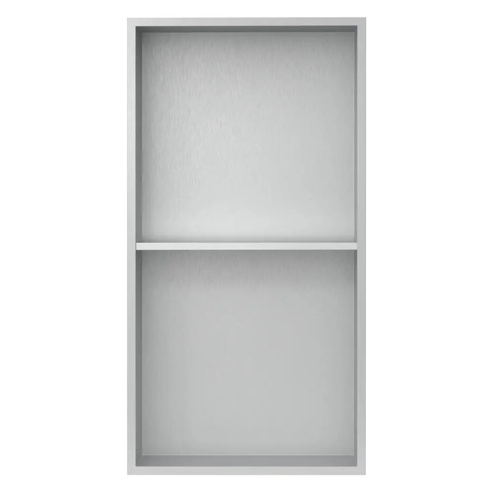 Nuestra hornacina de ducha establece nuevos estándares en términos de funcionalidad y diseño. Con dos niveles de 295 mm de altura cada uno, dispondrá de mucho espacio para guardar champú, jabón y otros utensilios de ducha. La generosa anchura de 300 mm le permite preparar cómodamente sus productos de cuidado. Gracias al ángulo de 91°, la hornacina se ha proyectado de forma que quede sujeta a la pared de forma segura y estable, sin caerse.
