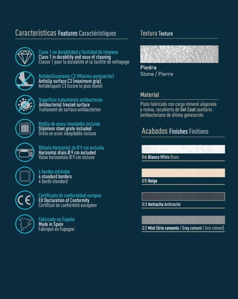 ✅ 100% CALIDAD. Plato Ducha Modelo Asturias de RESINA y Carga Mineral recubierto de Gel Coat sanitario Antibacteriano de última generación. Este material aporta una gran calidad al producto, siendo resistente al agua y los productos químicos de los champús y limpiadores. Platos de ducha FABRICADO EN ESPAÑA. Certificado de Conformidad Europea.