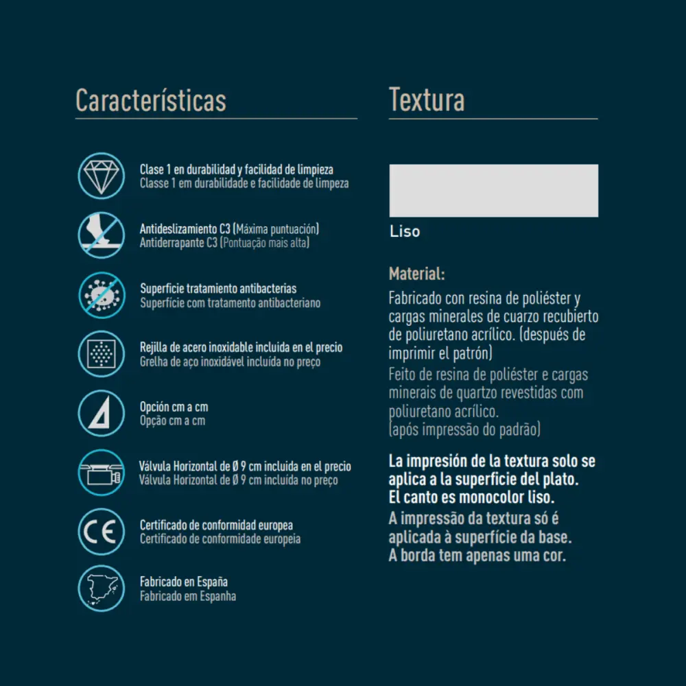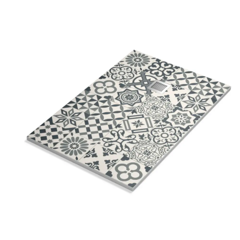 Plato ducha resina con carga mineral recubierto de poliuretano acrílico despues de imprimir el patrón (efecto geométrico hidráulico mosaico). Este plato es el mejor en cuanto a relación calidad – diseño – precio, siendo un plato con grandes cualidades. Todo precio mostrado es con el IVA incluido + transporte + válvula coat + rejilla. – Este modelo presenta un espesor de 3cm en todas sus formas. -Texturas: Liso. – Durabilidad: Clase 1 en durabilidad y simple limpieza. – Superficie con tratamiento antibacterias: Dando prioridad a la higiene y limpieza. – Antideslizante: Antideslizamiento C3 (máxima puntuación). – Rejilla de acero inoxidable: Incluido en el precio. – Válvula: Válvula Coat certificada, de 9cm de diámetro, incluida en el precio. – Hecho a medida: Este modelo no admite medidas, formas y colores especiales. – Fabricación: Todos nuestros platos de ducha están fabricados en España.