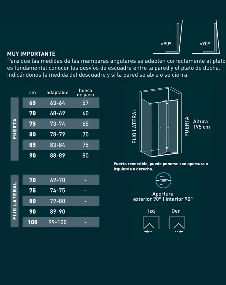 Mampara de ducha rectangular de 1 puerta plegable + 1 cristal fijo en el lateral, perfecta para quellos cuartos de baño que buscan tener un acceso amplio y cómodo a un plato de ducha pequeño en esquina. Esta mampara de ducha, el lado de puerta plegable tiene una apertura de 90º hacia el interior y otros 90º hacia el exterior, además de una altura de 195cm, vidrio templado de alta seguridad de 6mm y con tratamiento antical. Este modelo de 1 puerta plegable + 1 fijo en un lateral, tiene la puerta de la mampara de ducha con cierre magnético y es invertible, es decir se puede instalar la puerta abatible en un lado coomo en otro del plato de ducha e igualmente con el cristal fijo. Además la puerta cuenta 2 pomos dobles, en cada vidrio de la puerta, para poder tener un mejor manejo de la puerta tanto al abrir como al cerral. Esta mampara de ducha tiene rangos adaptables, por lo que será muy crucial tomar medidas una vez esté instalado ya el plato de ducha.