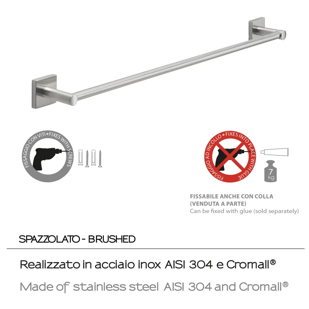 Ogni dettaglio è pensato per durare nel tempo: la barra cilindrica liscia si estende tra i supporti quadrati fissati al muro, offrendo un profilo continuo che coniuga funzione e raffinatezza. Questo pezzo si presta a diventare un oggetto da collezione per chi apprezza accessori di alta gamma funzionali, destinati a mantenere la propria eleganza nel tempo. L’abbinamento di Cromall e acciaio AISI 304 garantisce robustezza nell’uso quotidiano, mentre la finitura spazzo