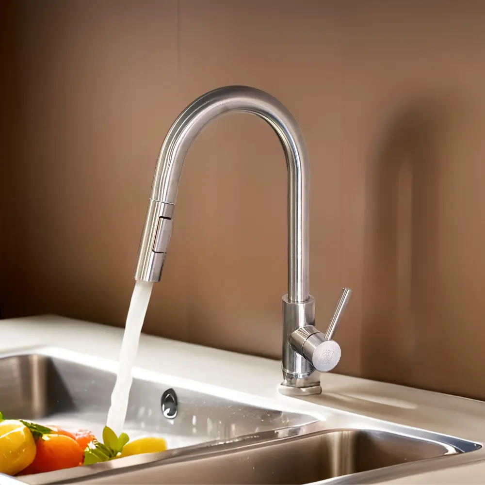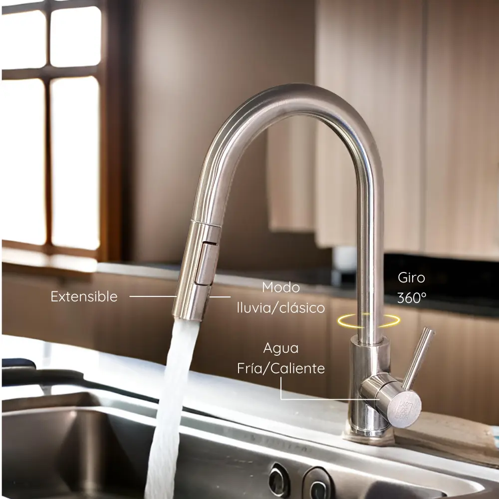 Grifo extraíble y ajustable que se adapta en forma de chorro o de ducha, proporcionando flexibilidad según las necesidades de uso en la cocina.