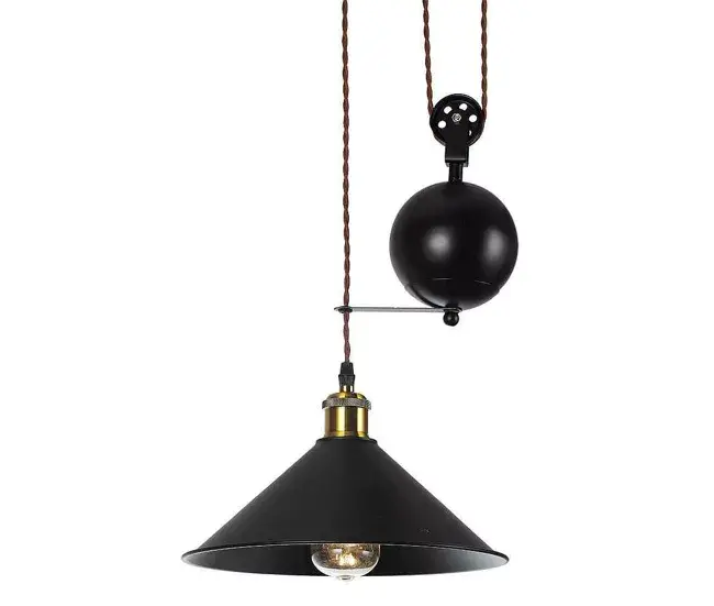 Colgante con polea modelo TRIGUERO de color negro con detalle en dorado. Realizado en metálico con un curioso sistema de altura regulable por una polea y cordón trenzado. Utiliza un porta lámparas E27. Bombilla no incluida.