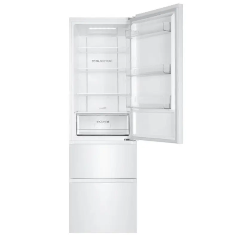 A partir de hoy vas a dar un giro radical a tu modo de almacenar y conservar la comida. Porque, sin duda, el novedoso diseño del frigorífico Haier HTR3619ENPW no es sencillo de descubrir y te enamorará por la facilidad y comodidad de uso. Su diseño con cajones que sustituyen a la arraigado puerta para la zona del congelador te va a dar muchas alegrías. Supone un increíble plus a la hora de prepararlo, pero también para acceder a lo que tienes almacenado en ellos. Mucho más sencillo de extraer, acceder a los alimentos y prepararlo sin que tengas que hacer malabares. Congelación ultra-rápida: Para aquellos momentos en los que necesitamos contar con un frigorífico combi potente, cabe resaltar que este frigorífico Haier cuenta con congelación ultrarrápida. Gracias a la función Fast Freezing el frigorífico concentrará toda su capacidad de congelación, de tal manera que podrá alcanzar hasta los -30º C en un abrir y cerrar de ojos. My Zone: elige entre las opciones: Este cajón está pensado