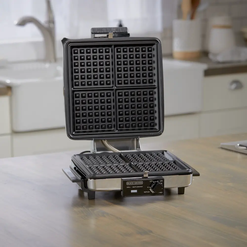 Cocinar el desayuno y almuerzo para su familia es conveniente con el diseño 3 en 1. Comience preparando waffles, luego invierta las placas de cocción y doble hacia atrás la parte superior con bisagra para abrirla en posición plana con 2 placas de plancha que le permiten cocinar huevos y tocino. Cocinar es sencillo con las canales de grasa que drenan los residuo de grasa de los alimentos. Para el almuerzo, prepare sándwiches tostados para satisfacer cualquier apetito.