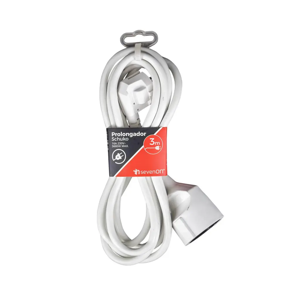 Cable alargador tipo f schuko 3m de 7hsevenon, indicado para llevar corriente de manera cómoda a lugares alejados cuando necesitamos utilizar aparatos eléctricos móviles. Con toma de enchufe de 16a y un voltaje/tensión de 230v ac (50 hz).este alargador ha sido fabricado en plástico pp de alta calidad y está disponible en color blanco o negro. Cuenta con una potencia máxima de 3680w y 1 toma con conector f (schuko). Su cable dispone de una longitud de 3 metros.gracias a su índice de protección ip20 está indicado para zonas de interior, protegido frente a sólidos de tamaño superior a 12mm. Cable alargador equipado con protección infantil para un uso resguardado. Este producto cuenta con los certificados ce & rohs.*ten en cuenta que las imágenes, medidas y colores de algunos de nuestros productos son datos orientativos. En ocasiones, las pantallas pueden provocar pequeñas variaciones de visualización a causa del calibrado, el ángulo, la luz y otros factores.Especificaciones