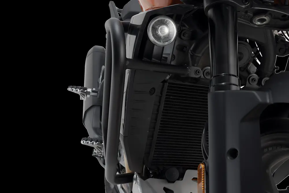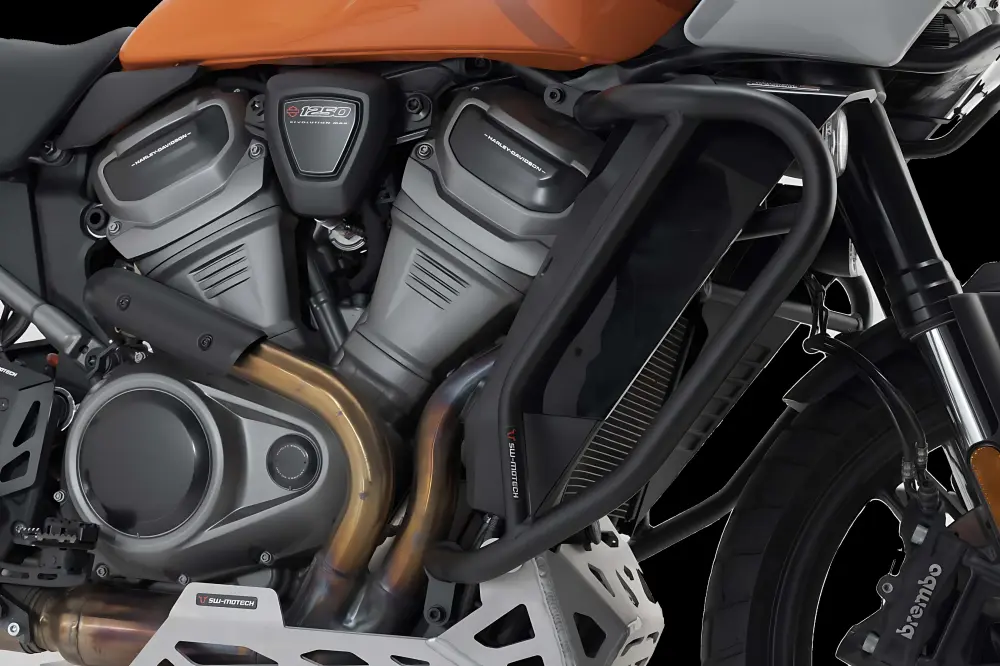Estas protecciones laterales de motor, confeccionadas a medida para la Harley-Davidson Pan America, están disponibles en color negro, con recubrimiento de polvo resistente a la intemperie y la corrosión. El acabado de la superficie se lleva a cabo en una instalación de última generación en la planta de SW-MOTECH en Brno en la República Checa.