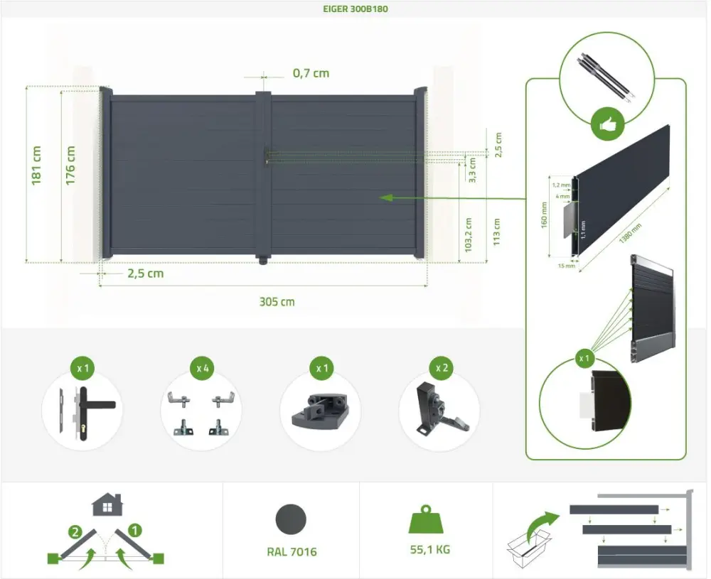 Puerta batiente de aluminio macizoanchura 300cm & altura 176cmcolor: gris anthracitaaccesorios incluidoscasanoov es especialista en puertas y portones en kit, para montar e instalar usted mismola puerta batiente eiger con su diseño práctico y actual posibilita una ocultación total para una mayor privacidad.descripción : puerta abatible recta de ocultación recta, 2 hojasmaterial : aluminiocolor : gris antracita (ral 7016)dimensiones : ancho 300 cm x alto 176 cmancho requerido entre pilares : 305 cmaltura mínima del pilar: 190 cminspirado y diseñado en franciaeste kit de puerta batiente para montar e instalar por ti mismo contiene :- 18 lamas con recubrimiento en polvo (altura 16 cm)- 2 lamas con recubrimiento en polvo reforzado para la motorización (altura 16 cm)- 2 bisagras superiores- 2 bisagras inferiores- 1 tope central- 2 topes final de carrera- 1 cerradura de cilindro – 1 manilla (color negro)- 5 llaves- tapas de acabado- tornillos y pernoslos postes no están incluidos en nuestros kits