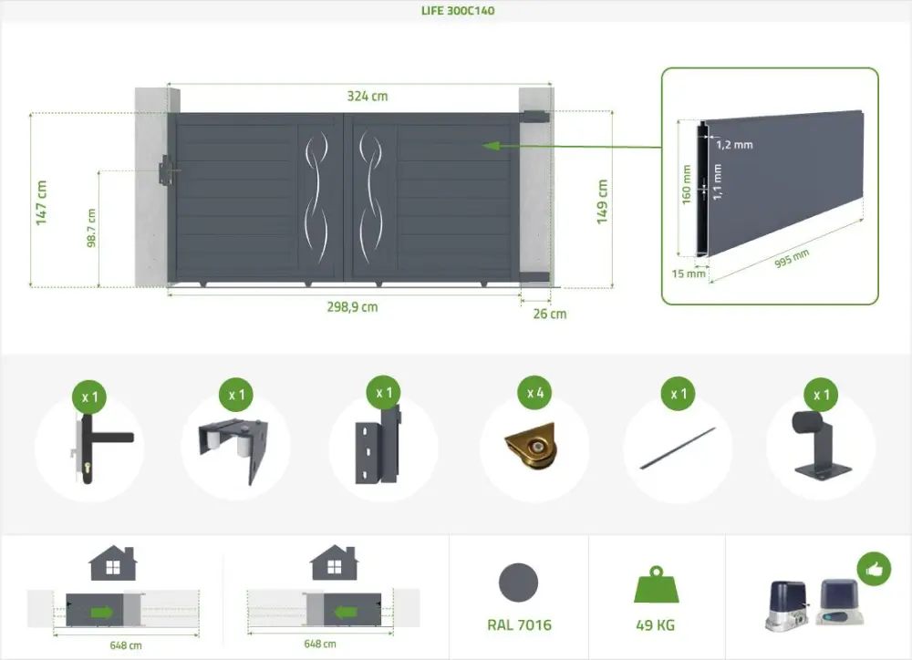 Puerta corredera life al. aluminio gris + 2 postes al. ● Indicador visual de funcionamiento correcto ● Protección contra copia de señal por intrusos ▶ Controla tu garaje con un clic