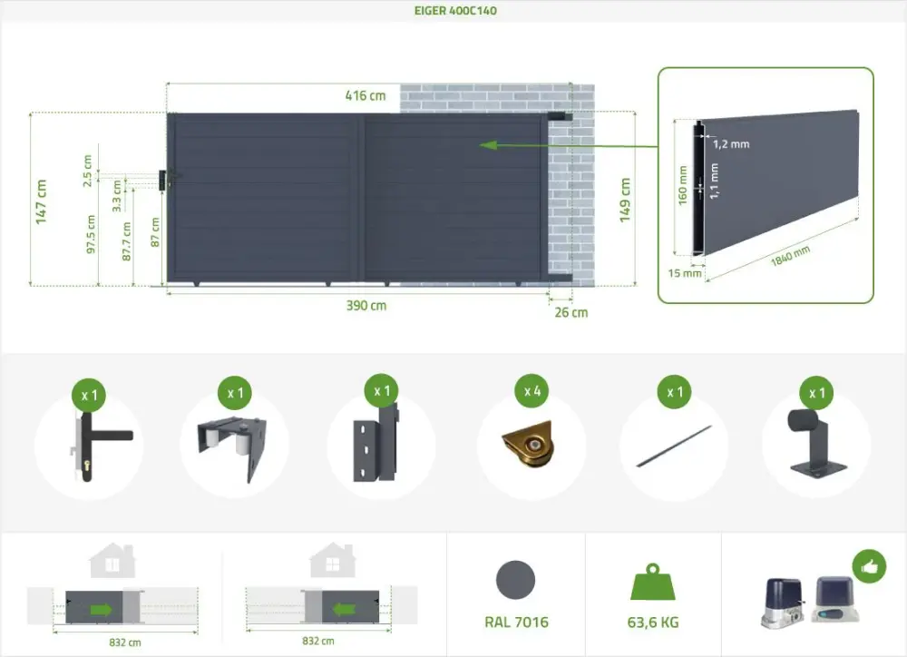 Puerta corredera 4m eiger al.140cm alu gris + 2 postes 20x20cm al.166cm