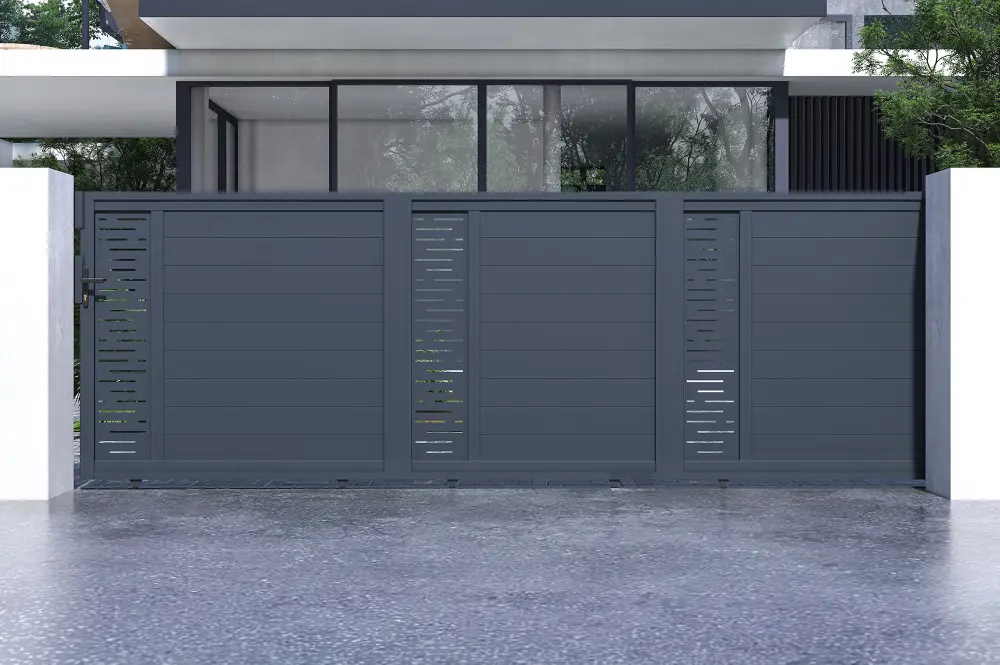 Descubre nuestra puerta corredera de aluminio ARLBERG XL, el equilibrio perfecto entre estilo y funcionalidad gracias a sus placas decorativas con el estampado “Graphic Lines”.