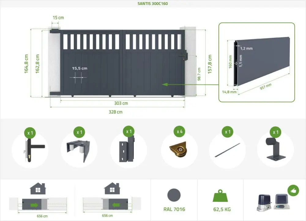 Puerta corredera exterior mixtabarrotes verticalesanchura : 303cm y altura : 163cmcolor: gris antracita (ral 7016)accesorios incluidoscasanoov es especialista en puertas y portones en kit, para montar e implementar usted mismoel puerta corredera exterior santis, con su diseño fácil y clásico, es el compromiso óptimo entre una puerta corredera calada y una puerta corredera ciega. este puerta corredera mixta con barrotes verticales le permitirá combinar luminosidad e intimidad gracias a zona formada por barrotes en la parte superior et una zona ciega de aluminio en la parte inferior.descripción: puerta corredera exterior mixta con barrotes verticalesmaterial : aluminiocolor : gris antracita (ral 7016)dimensiones : ancho 303cm x alto 163cmancho total requerido con espacio libre : 781cmaltura mínima del pilar : 175cminspirado y diseñado en franciaeste kit de puerta corredera mixta para montar e instalar por si mismo alberga :- 20 barrotes de aluminio (anchura 7.8cm)- 22 lamas con recubrimi