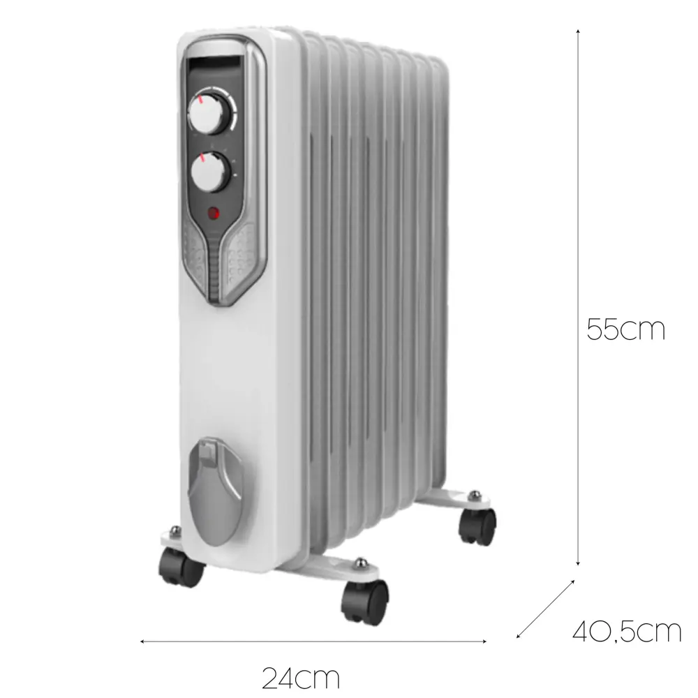 Calor y funcionalidad se unen en este radiador de aceite de 9 elementos para ofrecerte calor en tu hogar. Con este sistema de calefacción podrás calentar una estancia del interior de casa o de la oficina gracias a sus 2000 W. Solo tendrás que unir el aparato a la red eléctrica y elegir la potencia entre los tres niveles que ofrece (800/1200/2000 W).Atributos:– Medidas: 40,5x24x55 cm.- Tela: Metallo férrico.- Tono: Blanco.- Masa: 6,3 kg.- Montaje/tipo de unión: Unión de las patas con tornillería incluida.- Uso: Uso interior.- Potencia: 2000 W.- Superficie m²: 15/20 m² aproximadamente.- Tipo de instalación: Suelo.- Control remoto: No.- Temporizador: Sí.- Termostato de seguridad: Sí.- Regulador de potencia: 3 niveles.- Nº de elementos: 9.- Toma de corriente 220-240 VCA y 50Frecuencia actualización.- Asistencia para cable: Sí.- Ruedas: Sí.*No colocar cerca de baños, duchas o piscinas, no cubrir. Instalar al menos a un metro de muebles, cortinas o paredes. Limpiar con un paño suave y húmedo (no utilizar productos de limpieza) cuando esté desconectado de la corriente y totalmente frío.Especificaciones