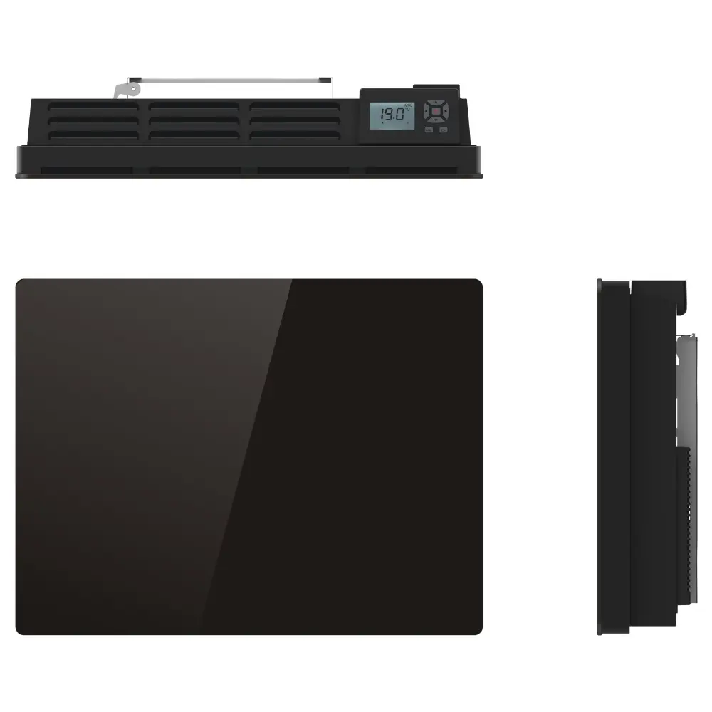 Calefactor cerámico de inercia seca con frontal de cristal.Control electrónico con pantalla digital LCD, 4 modos (confort, normal, eco y protección antihielo), 3 programas preinstalados, Programación diaria y semanal, Detección de ventana abierta, Protección contra sobrecalentamiento, Cable piloto de 6 órdenes, Panel curvo, Nueva Directiva ERP(2015/1188), Clase II, IP20. Norma CE/NF/RoHS/ERP.2 años de garantíaCARACTERÍSTICAS: Radiador eléctrico de inercia seca CERAMIC 1500 W Superficie calefactora indicativa: (≤ 15m²) Programación LCD. Nuevo diseño moderno, sobrio y elegante. Diseño made in France.Tono blanco. Calor suave. Núcleo calefactor: elementos cerámicos. Talla del radiador: 79x13xH45cm. Negro NegroPRINCIPIO DE FUNCIONAMIENTO: consiste en una piedra calentada por una resistencia que desprende calor durante varias horas. La piedra recoge y acumula el calor producido por las resistencias eléctricas integradas en el material y lo libera lentamente. El poder de inercia térmica depende del material elegido (cerámica, hierro fundido…) y del volumen del núcleo calefactor.VENTAJAS: Aumento rápido de la temperatura, calor homogéneo, mejor relación calidad-precio, consume menos energía que los paneles radiantes y sigue difundiendo calor una vez apagados. Más confortable que un calefactor convector, se adapta suavemente a la temperatura deseada. La radiación del calor permite instalarlo en habitaciones grandes. La sensación de calor es suave y continua.INSTALACIÓN Y MANTENIMIENTO: Fácil instalación con soporte de montaje. Perfecto para zonas de estar como el salón o la habitación de los niños. No requiere mantenimiento. Dispositivo de seguridad térmica de rearme automático. Fijación mural con cerradura. Kit de fijación incluido. 2 años de garantía. Empresa francesa con sede en Francia. Normas CE y NF.Especificaciones