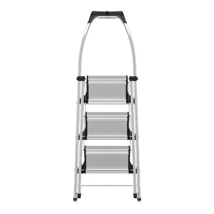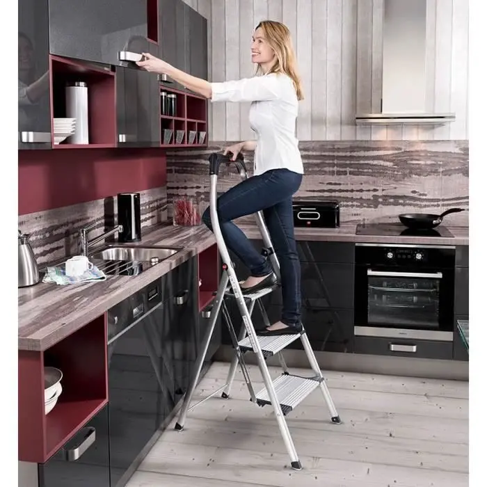 La escalera tiene 3 peldaños antideslizantes extra grandes, y una práctica bandeja para herramientas y piezas pequeñas. La barrera de seguridad alta y curvada está diseñada para un agarre blindado o para respaldarse en ella. Las patas antideslizantes aseguran una estabilidad óptima en diferentes superficies como el parquet, moqueta y azulejos.