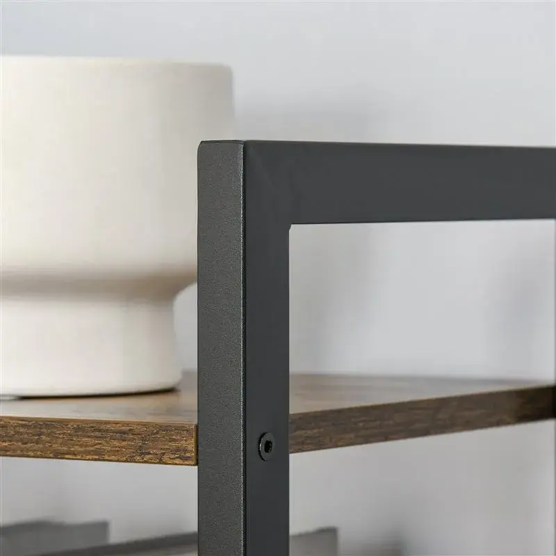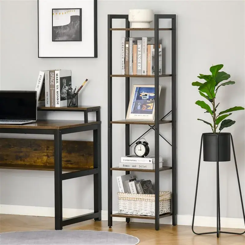 ¿Te gustaría presentar tus fotos o libros de forma elegante? Esta estantería de estilo industrial retro con 5 estantes Homcom está diseñada para ti, ofreciéndote espacio de almacenaje para todas esas cosas. Además, añadirás un toque llamativo a tu sala de estar, despacho, oficina, etc. Gracias a la combinación en negro de la estructura de acero y los estantes en color marrón oscuro rústico obtenerás ese toque industrial que estabas buscando. Esta estantería cuenta con 5 niveles para exhibir libros, plantas, recuerdos, etc. Está fabricado en acero resistente y tablero de aglomerado laminado de grado E1, muy resistente. Incluye un dispositivo antivuelco de seguridad para fijar a la pared, ofreciendo mayor seguridad. Cuenta también con almohadillas antideslizantes ajustables en los pies para sostenerlo firme incluso en suelos irregulares, así como un travesaño posterior en forma de cruz de refuerzo para mayor estabilidad.
