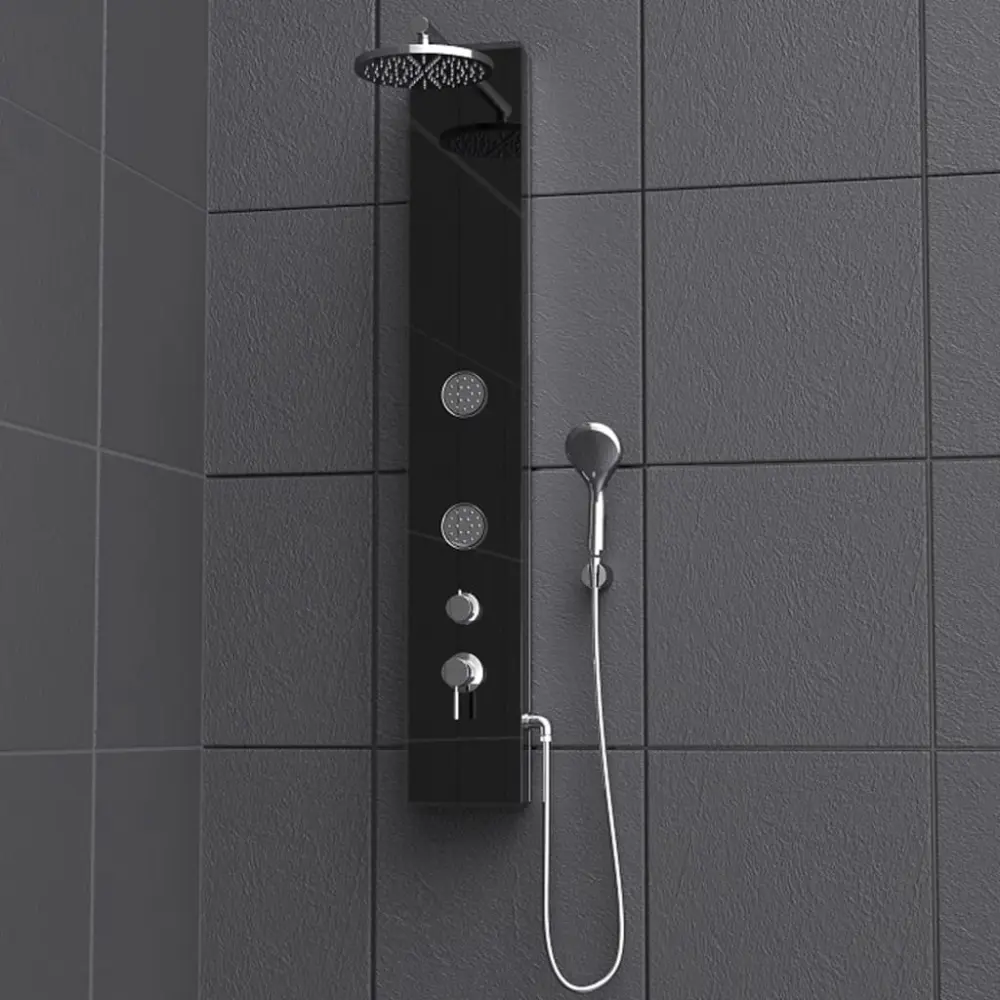 ¡Disfruta de una relajante ducha con este panel de ducha de vidrio de calidad con mezclador monomando GLASDUSCHPANEEL de SCHÜTTE!