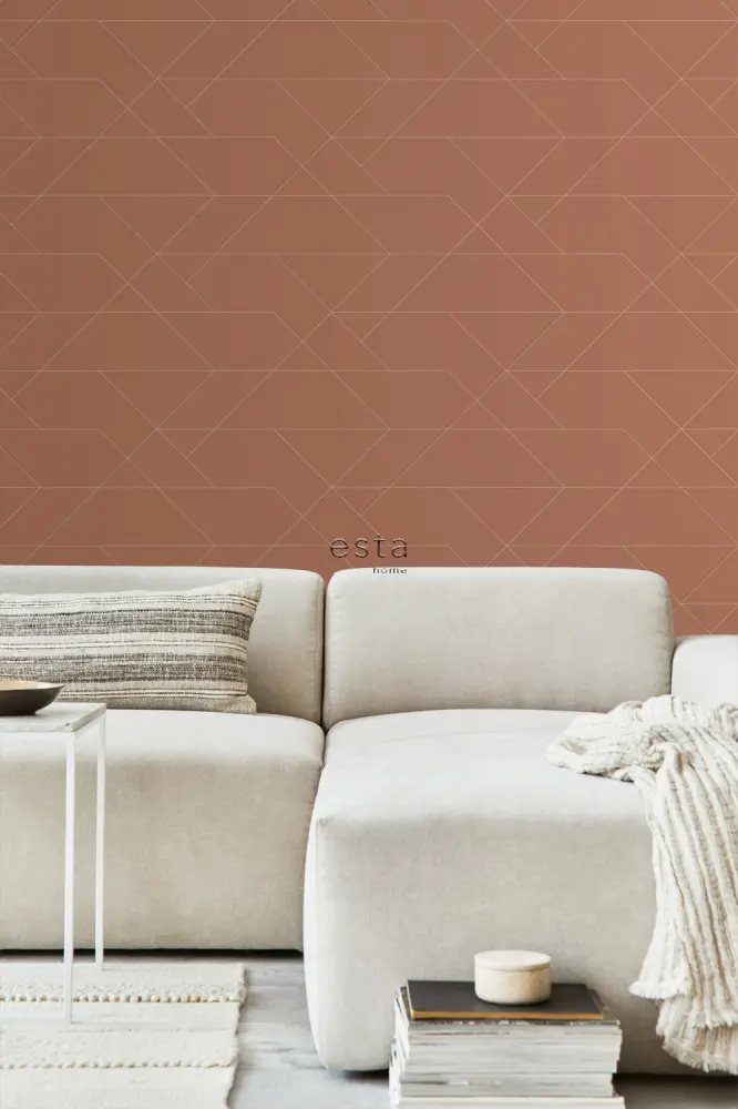Este reciente papel pintado con líneas gráficas en rojo barro cocido es un verdadero punto de mira y se adapta idealmente a un interior moderno. Puedes combinar este papel pintado no solo muy bien con colores claros y materiales naturales, sino también con tonos oscuros (grises) y maderas