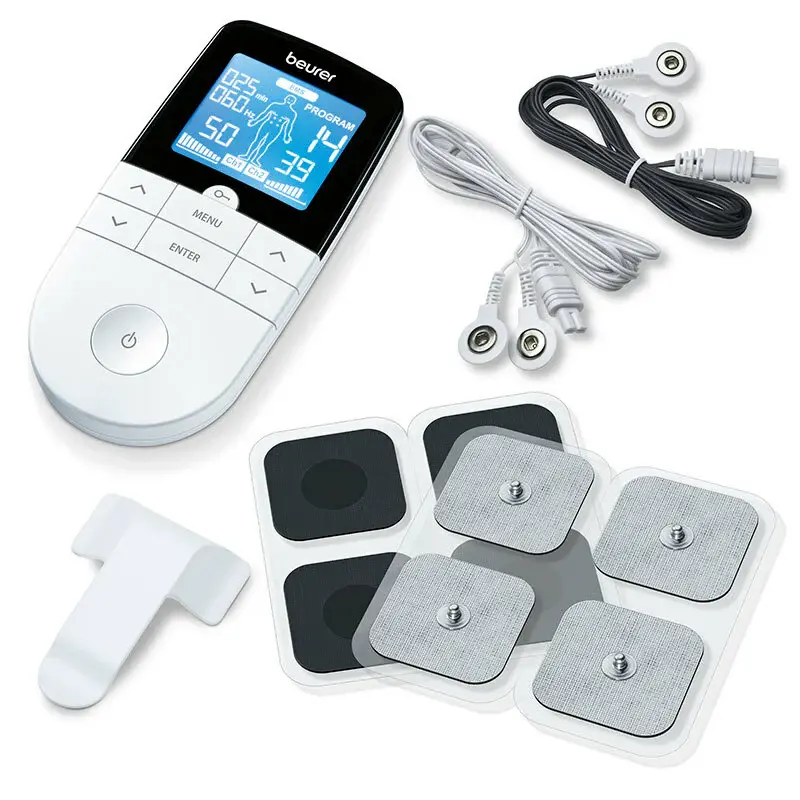 ¡Introduce tu código postal y consulta los servicios disponibles! El Electroestimulador Beurer EM-49 es tu aliado perfecto para el bienestar y la recuperación muscular. Con un diseño ergonómico y compacto (23 x 132 x 63 mm), este dispositivo 3 en 1 une estimulación nerviosa eléctrica transcutánea (TENS), electroestimulación muscular (EMS) y masaje relajante, ofreciéndote 64 programas preconfigurados para aliviar el dolor, mejorar la recuperación y aumentar tu bienestar. Equipado con dos canales ajustables y cuatro electrodos autoadhesivos, autoriza un uso personalizado y adaptado a tus necesidades. Su intuitiva pantalla LCD retroiluminada en azul facilita la selección de programas, mientras que la función Doctor te permite crear sesiones personalizadas. Incluye 6 programas ajustables, apagado de seguridad y funciona con pilas AAA (incluidas). Además, su práctico cinturón con clip te permite moverte cómodamente mientras disfrutas de sus beneficios. Descubre la tecnología Beurer y dal
