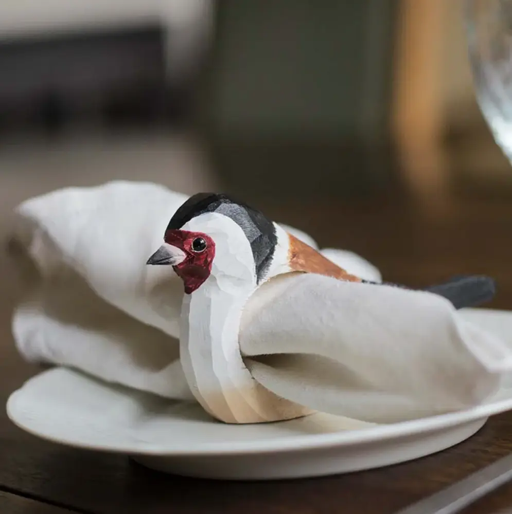 El servilletero está tallado a mano imitando el pájaro de jardín Jilguero. Hay una gran variedad de pájaros disponibles en nuestra línea de servilleteros. Mezcla y combina tus pájaros favoritos para crear una mesa divertida con un toque de naturaleza.