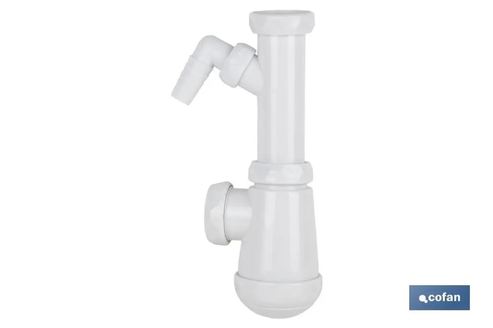 Sifón de botella extensible. Racor de 1 1/2 y toma auxiliar para electrodomésticos. Alta capacidad de desagüe. Tiene una toma de salida de ø40 mm y una junta cónica reductora de ø32 mm. Fabricado en pp de alta calidad y materiales anti calcáreos que permiten una mayor duración y menor desgaste del sifón.Especificaciones