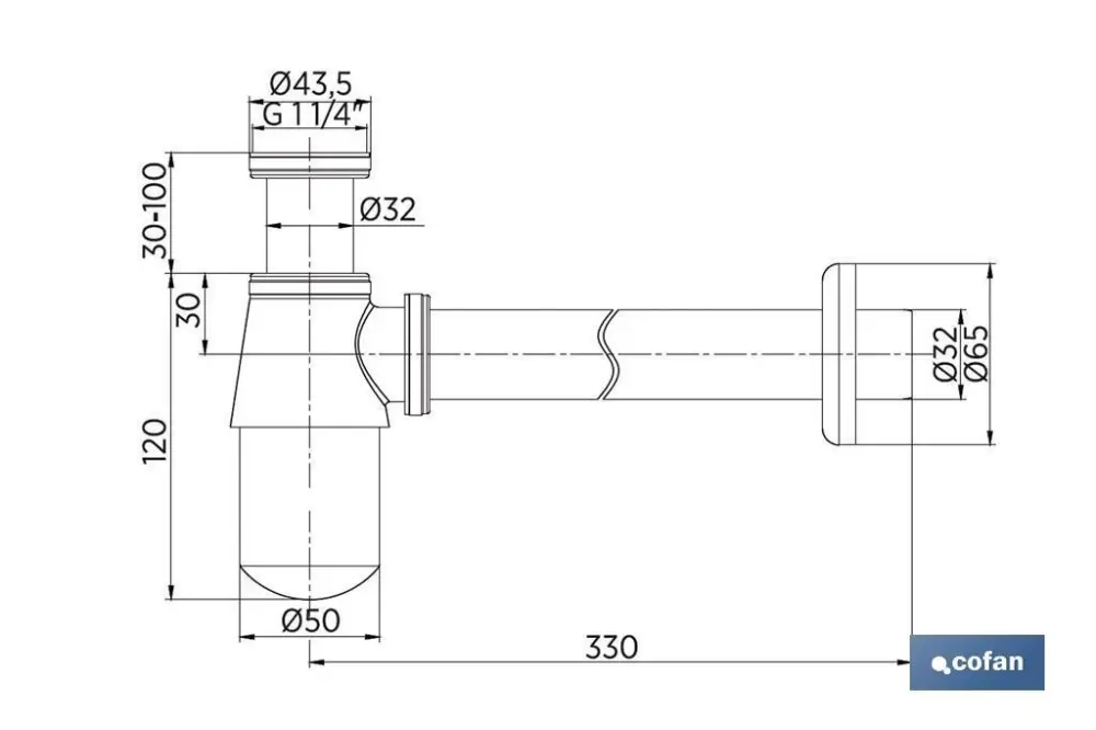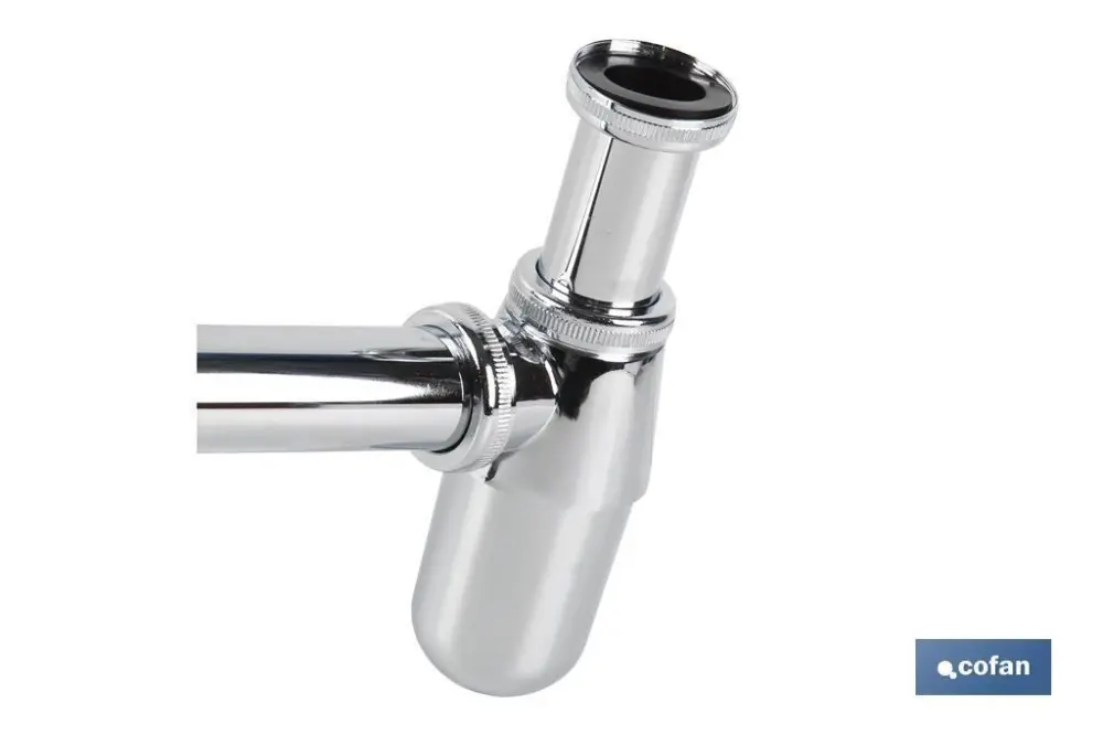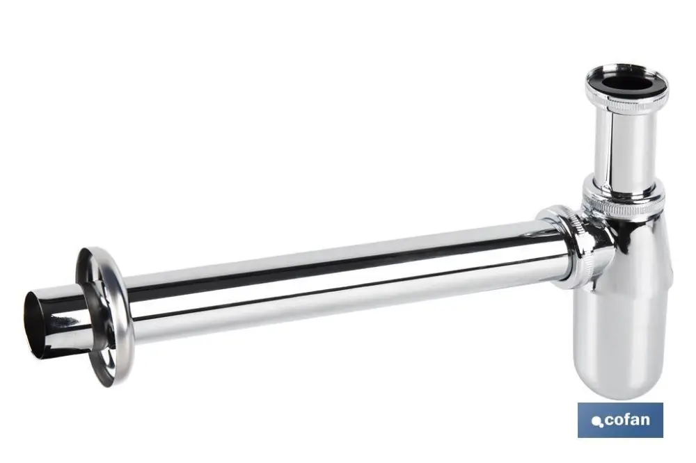 Sifón botella extensible. Gracias a su recubrimiento cromado brillante y atractivo, es ideal para instalaciones al descubierto. Alta capacidad de desagüe. Rosca 1 1/4. Salida horizontal de 330 mm de longitud y ø32 mm.Especificaciones