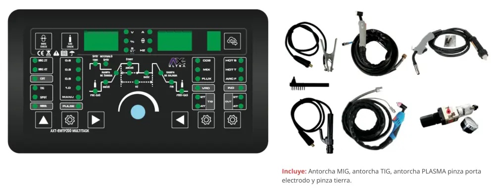 INCLUYE: Antorcha MIG, antorcha TIG, antorcha PLASMA pinza porta electrodo y pinza tierra.