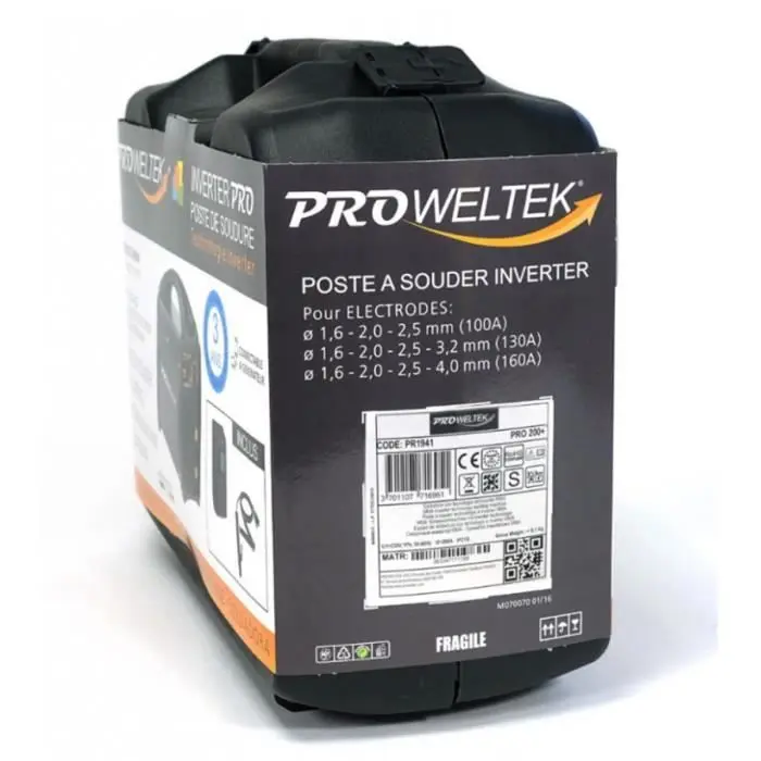 La estación de soldadura inverter MMA 200A+ DIGITAL suelda varillas de acero, hierro fundido y acero inoxidable con un diámetro de 1,6 a 5 mm. Esta estación de soldadura de alta gama puede ser manejada por todo tipo de usuarios, incluso principiantes. Se entrega con su máscara y cables en su estuche, es ideal para trabajos de soldadura comunes. Masa 4,8 kilos.Especificaciones