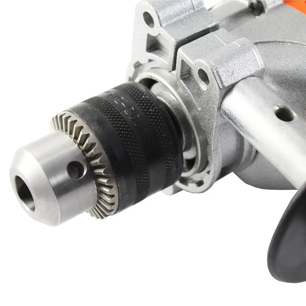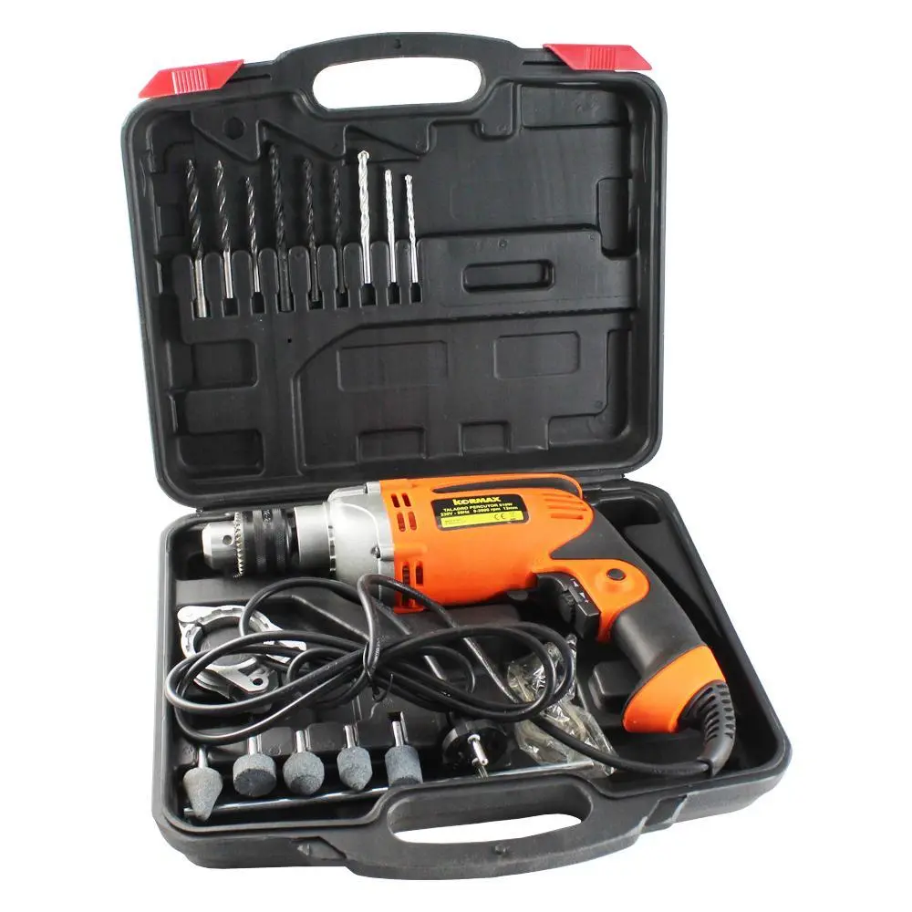Taladro percutor kormax. Diseño compacto con empuñadura para mejor agarre y manejo. Potente motor de 810 w también se puede llevar a cabo trabajos difíciles de forma sencillo y rápida. Este taladro ofrece la misma fuerza en el giro reversible. – plástico y hierro. – naranja. – 27 x 21,5 x 5 cm. – 3550 g. – 810 w. Portabrocas 14 mm. – incluye maletín con 17 accesorios. 3 brocas para piedra, 3 para metal, 3 para madera y 5 brocas esmeriles. empuñadura y varilla de hierro métrica.con maletinEspecificaciones