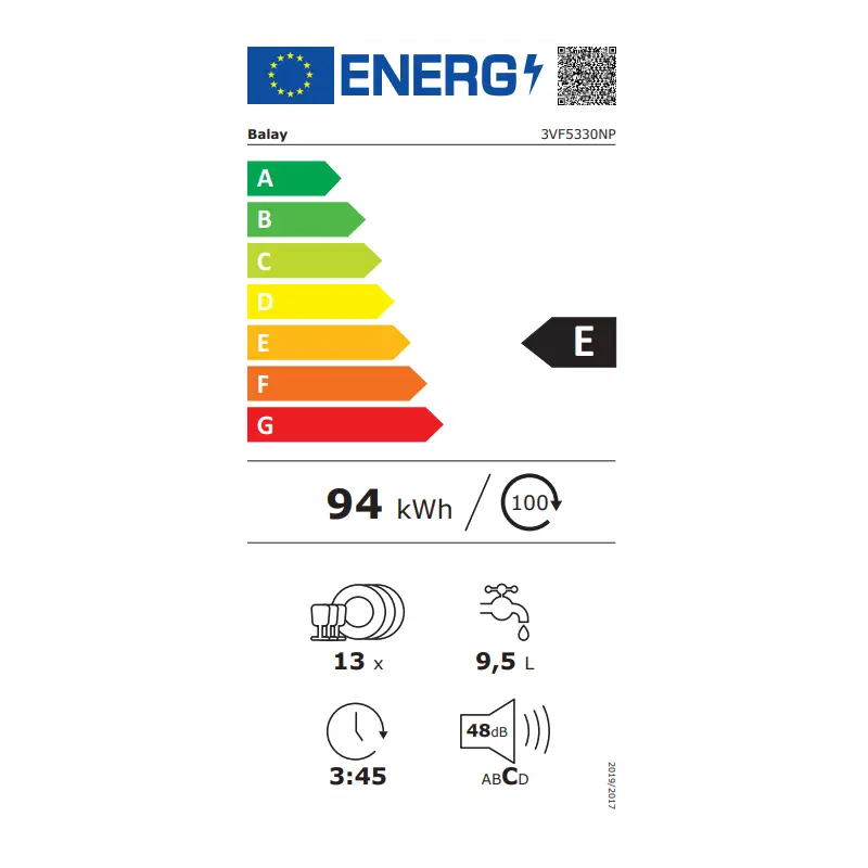 Ficha técnicamarcabalaymodelo3vf5330npcategoríalavavajillas 60cmcolorinox característicasconsumo de agua (l)9,5tipo de construcciónintegrablealtura de la encimera extraíble (mm)0dimensiones del aparato815 x 598 x 550medidas del nicho de encastre815-875 x 600 x 550fondo con puerta abierta a 90 grados (mm)1150patas regulablessí- solo frontalesajuste máximo de las patas (mm)60zócalo regulableambos horizontal y verticalpeso neto (kg)43,924peso bruto (kg): 46,0intensidad corriente eléctrica (a)10tensión (v)220-240frecuencia (hz)50 – 60longitud del cable de alimentación eléctrica (cm)175tipo de clavijaschuko con conexión a tierralongitud del manguito de entrada (cm)165longitud del manguito de salida190 características de consumo y conexiónnúmero de opciones de posición13clase de eficiencia energética (2010/30/ec)econsumo anual de energía (kwh/annum) – nueva (2010/30/ec)262,00consumo de energía (kwh)0,92consumo de energía en modo sin apagar (w) – nueva (2010/30/ec)0,50consumo de energía en mo