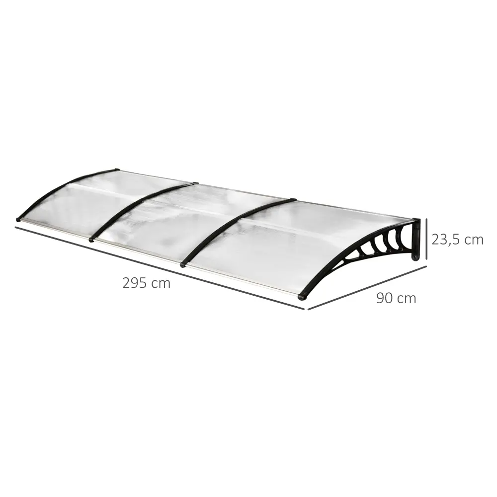 Las marquesinas curvas de Outsunny ofrecen una protección integral. Perfecto para resguardar puertas y ventanas del mal tiempo o la incidencia directa del sol. Hechas con paneles de policarbonato, cuentan con soportes de plástico rígido para fijar en la pared y perfiles de aluminio en los extremos y el medio. Su forma curvada ofrece una mejor protección y evita la acumulación de agua. Al llevar un recubrimiento anti-UV, ayuda a que los hogares no se recalienten tanto por los rayos solares en verano. Atributos: Protege ventanas o zonas de paso de la lluvia, viento o granizo Marquesina de pared con soportes de plástico PP rígido y resistente, conectados a los paneles de policarbonato con perfiles de aluminio Los paneles de policarbonato curvos ofrecen una protección más integral y evitan la acumulación del agua de la lluvia Incluye todos los elementos necesarios para su montaje Paneles de policarbonato con protección UV resistente a temperaturas extremas Se requiere montaje Especificaciones: Tono: hoja transparente y soporte negro Tela: plástico PP, polipropileno y aluminio Medidas totales: 90x295x23,5 cm (LxANxAL) Tamaño del soporte de pared: 90×23,5 cm (LxAL) Referencia: B70-048Especificaciones