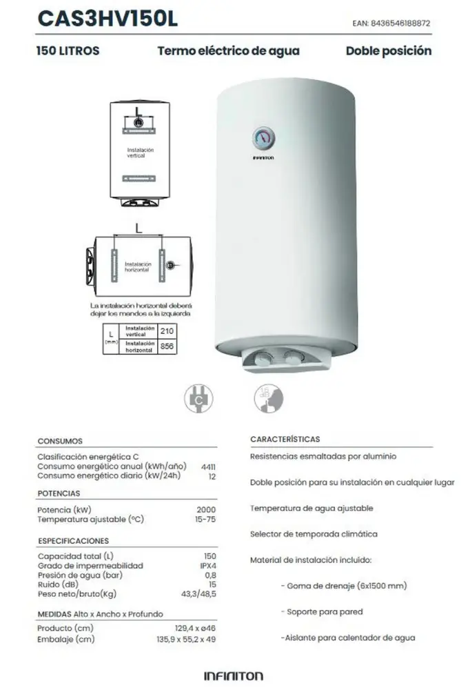 Resistencias esmaltadas por aluminiodoble posición para su instalación en cualquier lugartemperatura de agua ajustableselector de temporada climáticamaterial de instalación incluído:- goma de drenaje (6×1500 mm)- soporte para pared-aislante para calentador de aguaEspecificaciones