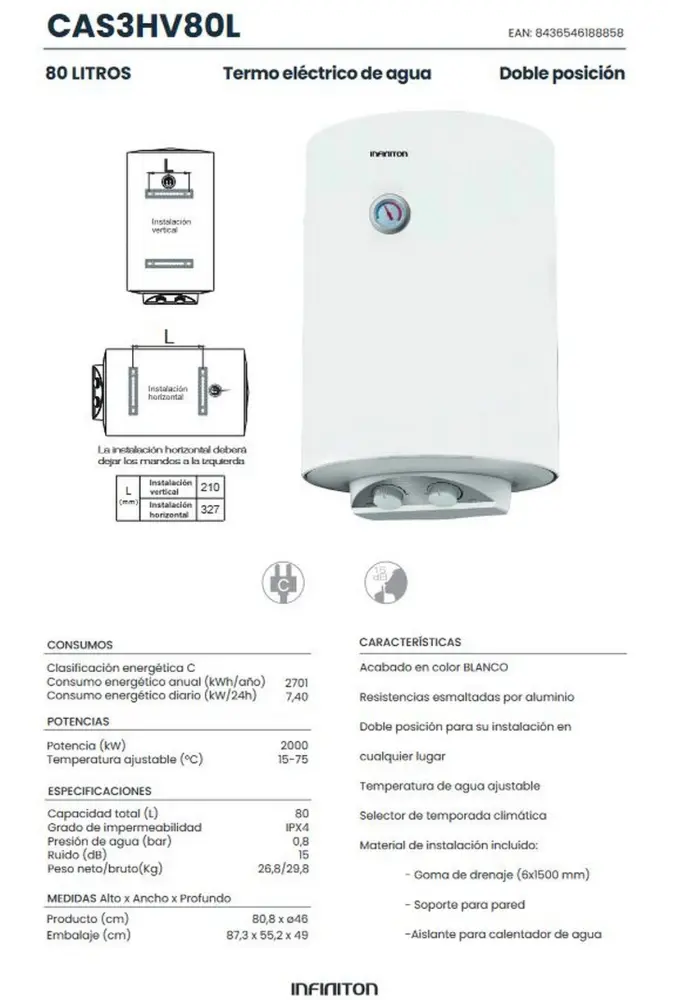 Acabado en color blancoresistencias esmaltadas por aluminiodoble posición para su instalación encualquier lugartemperatura de agua ajustableselector de temporada climáticamaterial de instalación incluído:- goma de drenaje (6×1500 mm)- soporte para pared-aislante para calentador de aguaEspecificaciones