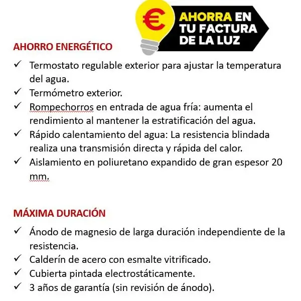 Incluye Incluye para su instalación: válvula de sobrepresión (8 bar), manguitos electrolíticos, escarpias y tacos/cable de conexión eléctrica con clavija incorporada.