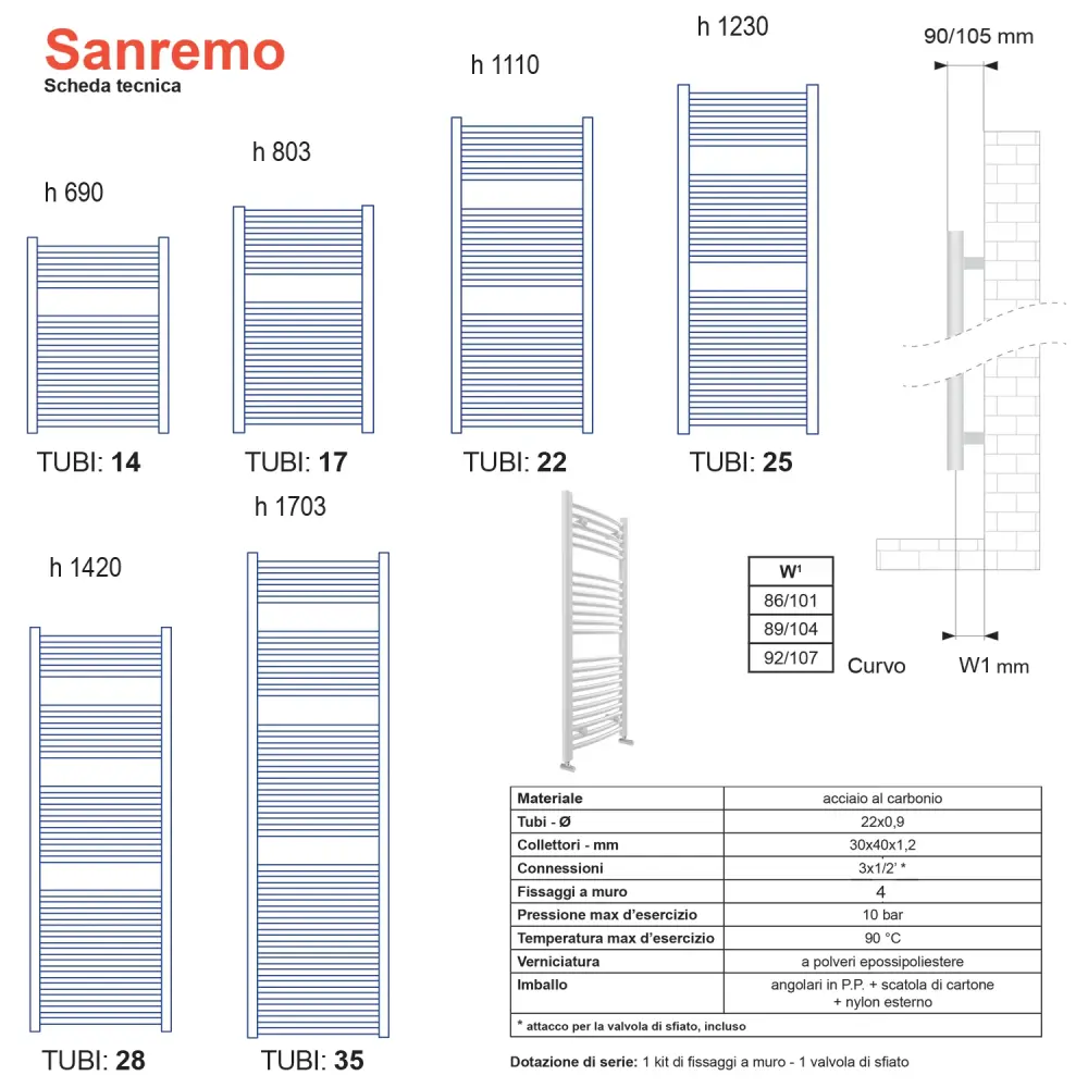 Il termoarredo scaldasalviette Lazzarini Sanremo unisce design contemporaneo e funzionalità: le 14 tubature centrali leggermente curve conferiscono una linea elegante e permettono di asciugare gli asciugamani con facilità, adattandosi a ogni bagno moderno. Realizzato in acciaio al carbonio con collettori laterali squadrati, è pensato per chi cerca un elemento riscaldante durevole e di qualità, che sappia valorizzare l’ambiente senza appesantirne lo stile. La finitura bianca a polveri epossipoliestere garantisce resistenza alla corrosione e una superficie uniforme nel tempo. Viene fornito integral di attacchi a muro e valvolino di sfiato, pronto per l’installazione.