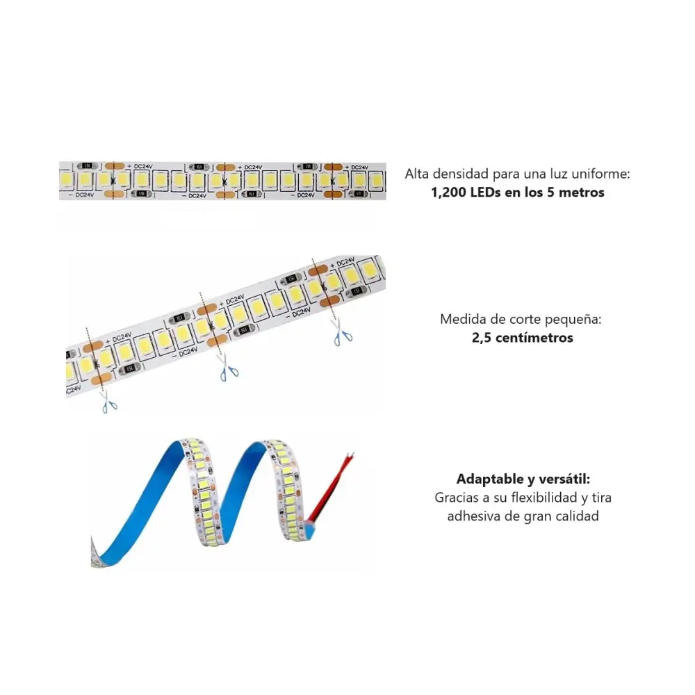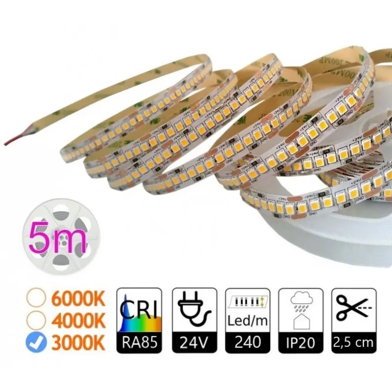 Tira led de alta luminosidad que ofrece una alta luminosidad, 1800 lúmenes por metro. El consumo de potencia es de 18 w por metro, lo que da como resultado unos 100 lúmenes por vatio. Tales cifras se consiguen gracias a su chip smd2835 y a la alta densidad: 240 leds/m. Además puede doblarse y curvarse en un eje según las necesidades debido a su gran flexibilidad.Con 10 milímetros de espacioso, esta tira es idónea para encajar en una gran variedad de perfiles. Recomendamos siempre colocar las tiras led sobre un perfil de aluminio para la mejor disipación de calor y alargar la vida útil de la propia tira.Además se puede cortar cada 25 milímetros, lo que facilita la instalación de la misma. la luz blanca cálida es el tono de luz más amarillo de todos los tonos de blanco habituales.esta luz ofrece una sensación de iluminación suave y agradable. Los colores serán fieles y la sensación de luz será menos intensa, pero muy cómoda para la vista. Perfecta para salones rústicos, iluminaciones decorat