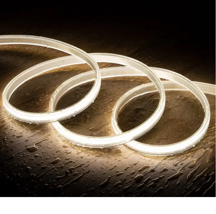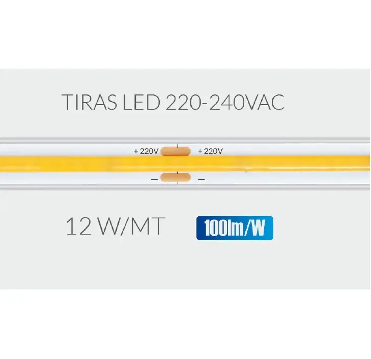 La Tira LED COB de 220V AC es una excelente opción para iluminar cualquier espacio, ya sea en interiores o exteriores. El LED COB brinda una gran cantidad de luz contínua sin puntos y un tono blanco neutro que se ajusta a cualquier decoración. Además, cuenta con un grado de protección IP65, lo que la hace resistente a polvo y chorros de agua y perfecta para proyectos de iluminación