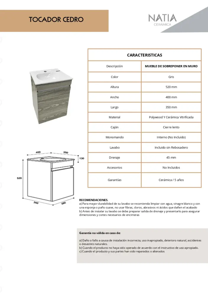 TOCADOR CON LAVABO SIN REBOSADERO MOD. CEDRO GRIS NATIA