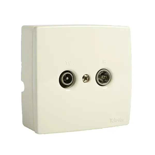 Caja de paso puenteada con dos conectores CEI (macho a la izquierda y hembra a la derecha) con salidas TV+SAT. Permite ejecutar una instalación en serie de varias tomas. Al ser puenteada está disponible en ambos conectores toda la señal de entrada de FM, TV y SAT