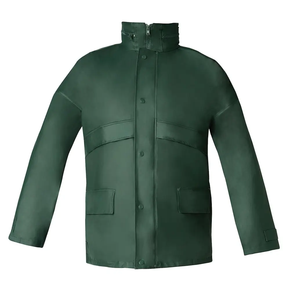 Traje agua verde poliuretano talla 8-xl.- costuras termoselladas.- capucha dentro del cuello con cierre de cremallera, con cordones de ajuste.- muy poco peso, mayor ligereza.- puños ajustes con botón a presión.- ajuste en cintura con cordón y botones a presión.- tapeta central, cierre cremallera.- repele el agua.Pantalón:- goma elástica para toda la cintura.- ajuste bajos pantalón por corchete a presión.- articulo también conocido como: chubasquero, impermeable, pantalón y chaqueta impermeable, pantalón y cazadora impermeale, impermeable de moto, impermeable de hombre, impermeable completo, poncho impermeableEspecificaciones