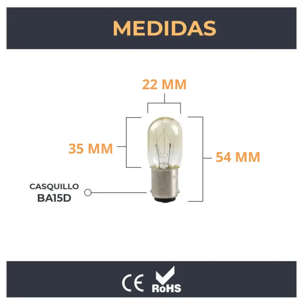 Bombilla de Bayoneta Ba 15 D para máquina de coser de 22x54mm y 15W de potencia para máquinas de coser y todo tipo de aparatos aptos para este sistema de rosca. Las medidas de la bombilla que se indican son aproximadas.