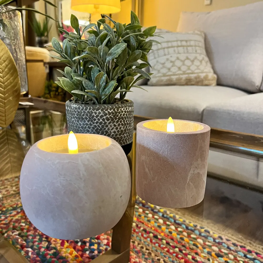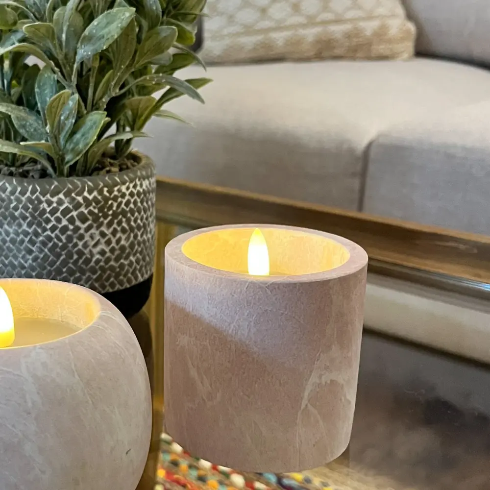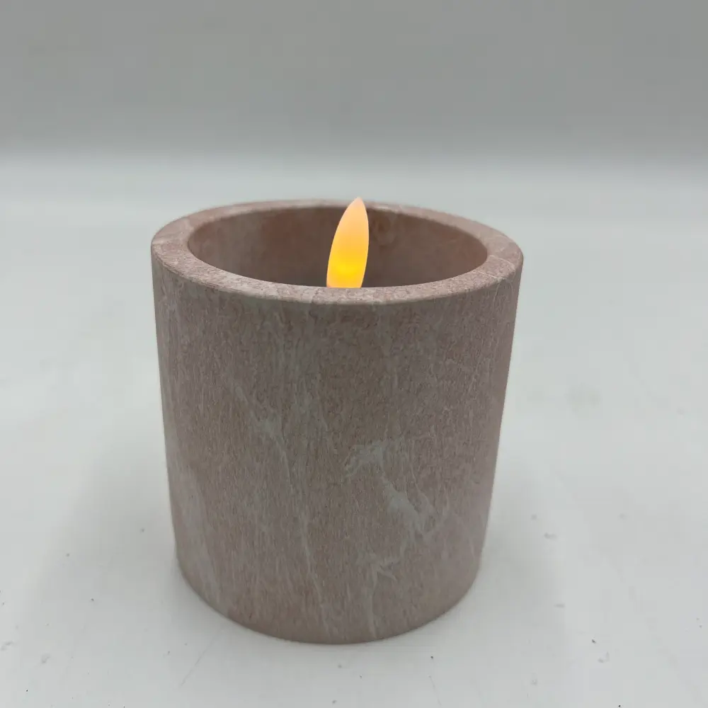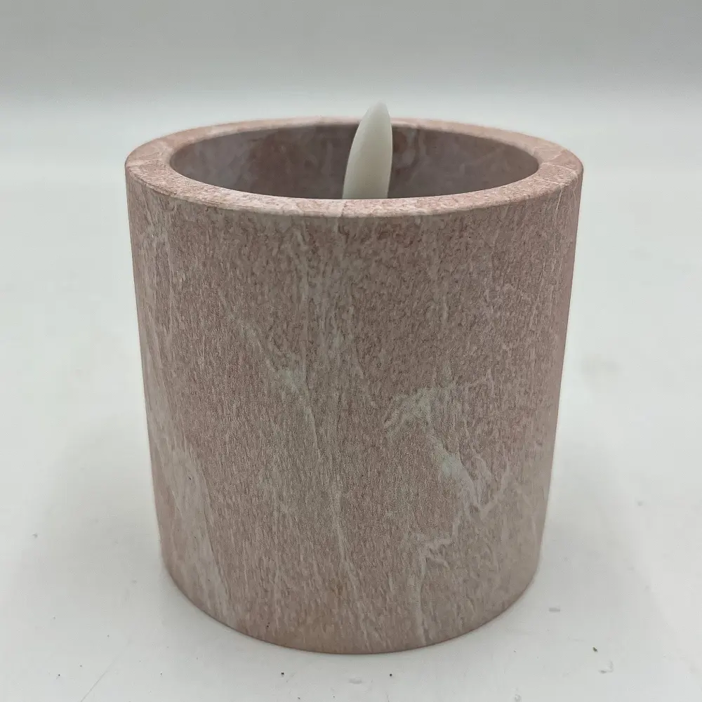 Una vela decorativa color rosada adecuado para colocar en cualquier espacio y aportar esa calidez tan deseada. Una vela led de cera y cemento con vetas en blanco de 8x8x9 perfecta para cualquier rincón. Disponible también en color marrón.