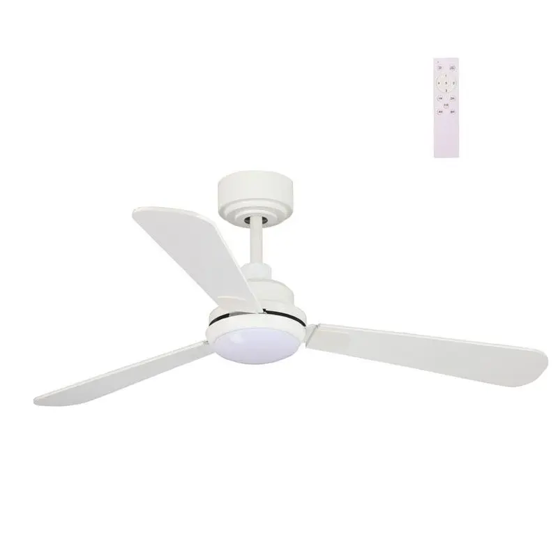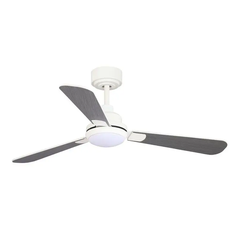 Ventilador con motor DC de 5 velocidades. Su principal ventaja decorativa, cuenta con unas palas reversibles, que te permiten seleccionar entre un tono ceniza o blanco. También puedes regular su altura, ya que incorpora dos tizas. Permite la instalación en techos inclinados de hasta 15º. Gracias a su mando podrás regular la temperatura de luz (cálida / neutra / fría). Además, de esta función el mando incluye temporizador y función inversa (Verano – Invierno).Especificaciones