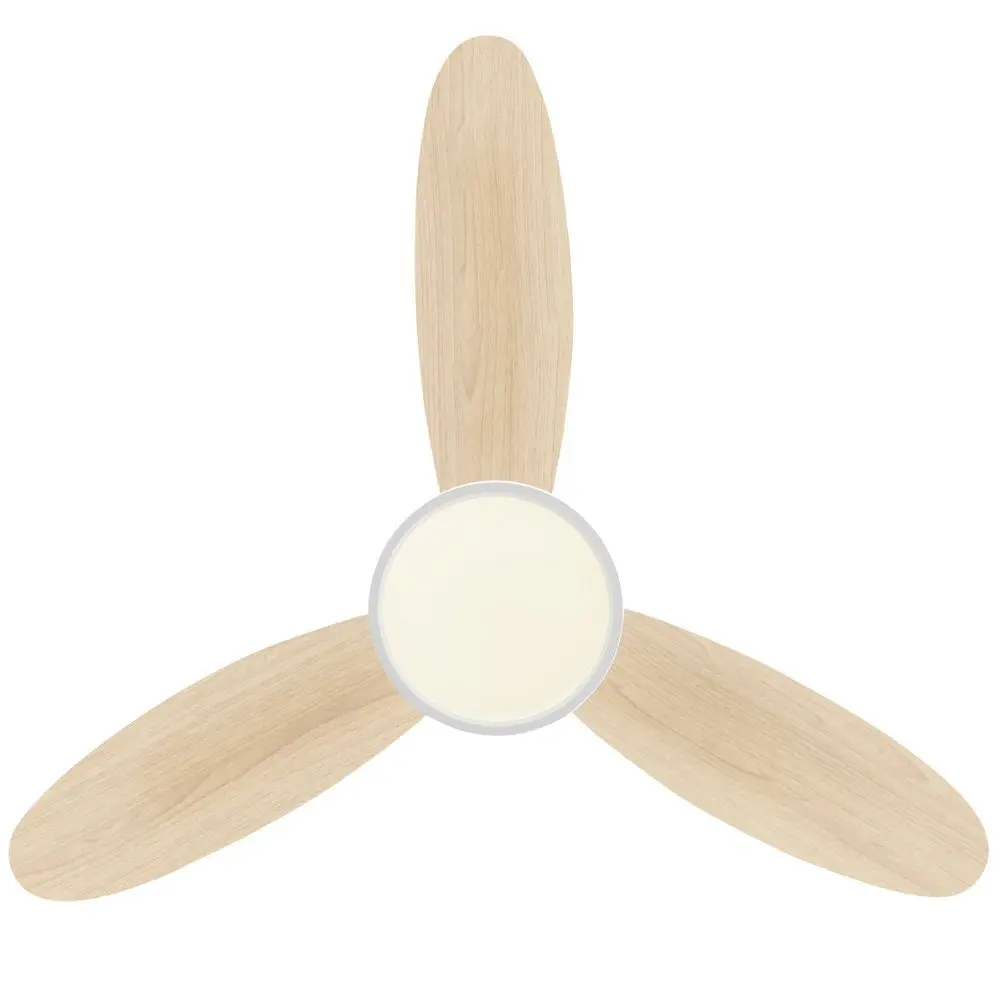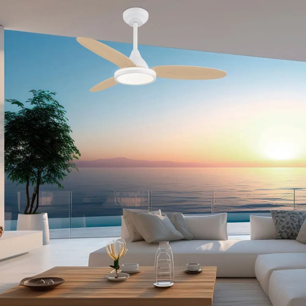Ventilador de techo de la serie MAHON realizado en metal, aspas en ABS y difusor acrilico, en color blanco madera, con tres aspas.Motor DC ultrasilencioso, seis velocidades.Tecnología LED DIMABLE incorporada con una potencia de 21W, 1890 lúmenes y 3 TEMPERATURAS SELECCIONABLES DE LUZ (3000-4500-6500K) luz cálida, natural y blanco frío.De diseño muy contemporáneo y original, ideal para colocar en dormitorios, salas de estar y estudios inspirados en los nuevos estilos de decoración como el Industrial ó moderno.Tiene unas dimensiones de 107X43 cm.Control de aire verano o invierno.Mando a distancia INCLUIDO con MEMORIA DE COLOR incorporada y TEMPORIZADOR DE APAGADO.VelocidadPotenciaRpmFlujo AireNivel sonido1 6. 8 W 150 rpm 7000 m3 20 dB2 8 W 160 rpm 7000 m3 25 dB3 9. 1 W 170 rpm 7000 m3 31 dB4 10. 8 W 180 rpm 7000 m3 37 dB5 12. 3 W 190 rpm 7000 m3 45 dB6 14 W 200 rpm 7000 m3 52 dBIncluye el motor DC que reduce mas de un 50% de ahorro energetico, ademas de ser menos pesados, ultra silenciosos y t