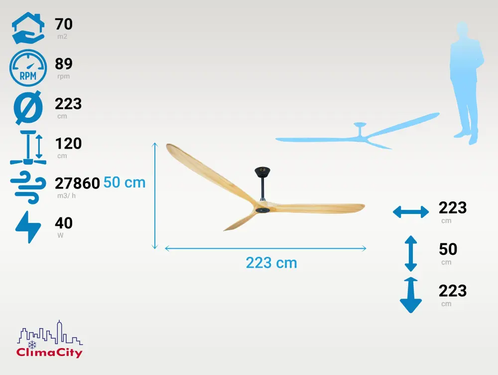 El GERONIMO BK SW 223 es un completo ventilador de techo que destaca por su multifuncionalidad. Fabricado en acero, su motor de corriente continua de gran potencia alcanza gran velocidad. Además sus 3 palas de madera y gran diámetro (223cm) lo hacen ideal para superficies de hasta 70m2.