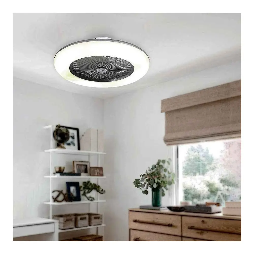 Ventilador de techo de siete aspas interiores con plafon led modelo SEVILLA, realizado en policarbonato acabado blanco, de medidas 55 cm de diametro. Tecnología LED integrada con una potencia de luz de 36w atios.De luz regulable con tres temperaturas de color (desde 3000, 4200, 6000 k). Ademas incluye mando a distancia.CONSUMOFLUJO AIREVERANORPM / NIVEL SONIDO 1ST1000 m³39W855-30DB 2ND1300 m³45W935-40DB 3RD1600 m³50W1030-45DBLa lampara ventilador SEVILLA, tiene motor AC de3 modos de ventilación, lleva el sistema interno de aspas, y es muy facil de instalar, ya que viene completamente montado de fabrica, solo necesita unirse a la red y listo. Diseño moderno y decorativo, que por dimensiones no dificulta estéticamente la visión del lugar al ser instalado, con un anclaje facil y seguro. Por su estructura podrás instalarlo tanto en el techo como en la pared, y para tu comodidad también incluye mando a distancia.Este modelo de ventilador pertenece a la nueva generación en diseños de ventiladores de techo con la máxima seguridad, a simple vista no se aprecian las aspas, ya que se encuentran en el interior del plafón. Además podrás elegir entre sus tres temperaturas de color de luz, para elegir la que mejor se adapte en cada momento, todo ello desde el control remoto y sin renunciar al mas moderno estilo y diseño. Lo ideal para instalar el ventilador, esen el centro de la habitación.Las palas deben sostener una distancia de seguridad de unos 0,50 cm hasta cualquier obstáculo lateral y una distancia en altura mínima de 2,10 centímetros del suelo. Hay que tener en cuenta la normativa de seguridad.Los ventiladores de techo son productos que pertenecen a la clase eléctrica I.Por lo tanto, deben estar conectados a tierra y están prohibidos para su uso en el cuarto de baño. Normalmente cuando termina el verano y entramos en el frío invierno, todos nos olvidamos del ventiladory queda solo como una lámpara o un objeto decorativo. Si necesita mas información sobre este producto, no dude en contactar con nosotros y estaremos encantados de cuidarle.Especificaciones
