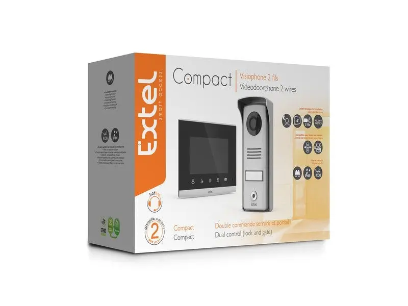 marca del producto: extel tipo de instalación: con cable instalación unidad exterior: superficie distancia máxima entre placas y unidad interna (en m): 100 longitud de cable entre pantalla y cámara (en m): 100 visera impermeable: si material del exterior panel: metal número de anillos: 6 control de volumen: sí nivel máximo de sonido (en db): 80 giratorio cámara: no ángulo de visión de la cámara (en °): h90 / v48 cámara de visión nocturna: sí rerespuesta de la pantalla: definición estándar ajuste de contraste: sí ajuste de brillo: sí ancho de la unidad exterior (en cm): 7 altura de la unidad exterior (en cm): 18 grosor de la unidad exterior (en cm): 2,8 diagonal de la pantalla (en cm): 11 material de la estación interior: plástico ancho de la estación interior (en cm): 19,7 altura de la estación interior grosor interior (en cm): 14,9 grosor de la unidad interior (en cm): 1,4 es bueno saberlo: • facilidad de uso e instalación – visión nocturna led infrarroja roja – pantalla de 4» con teclas táctiles – función polarity protect para resguardar tu videoportero de malas conexiones • compatible con todas las casas – placa calle estrecha (70mm) compatible con todos los postes – hasta 100m entre tu cancela y tu puerta de entrada – controla tu pestillo y motorización de tu cancela (compatible con todas las marcas) • más seguridad – vigilancia gracias a la función de monitorización de tu entrada incluida – estanqueidad ip 44 – antirrobo ik08 y placa calle de aluminio – 2 años de garantíaEspecificaciones